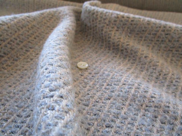 生成りとうすブルーにナイロンのラメののような糸がやさしい色の中に光っています。